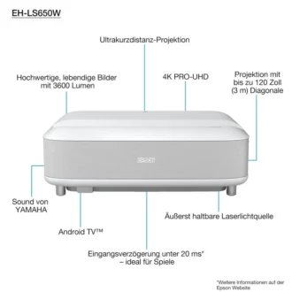Ursprünglicher Preis war: 1099,00 €824,25 €Aktueller Preis ist: 824,25 €.Save 274,75 €Epson EH-LS650W 3LCD Ultrakurzdist. Pojektor 3600 Lumen 4K PRO-UHD HDMI Weiß