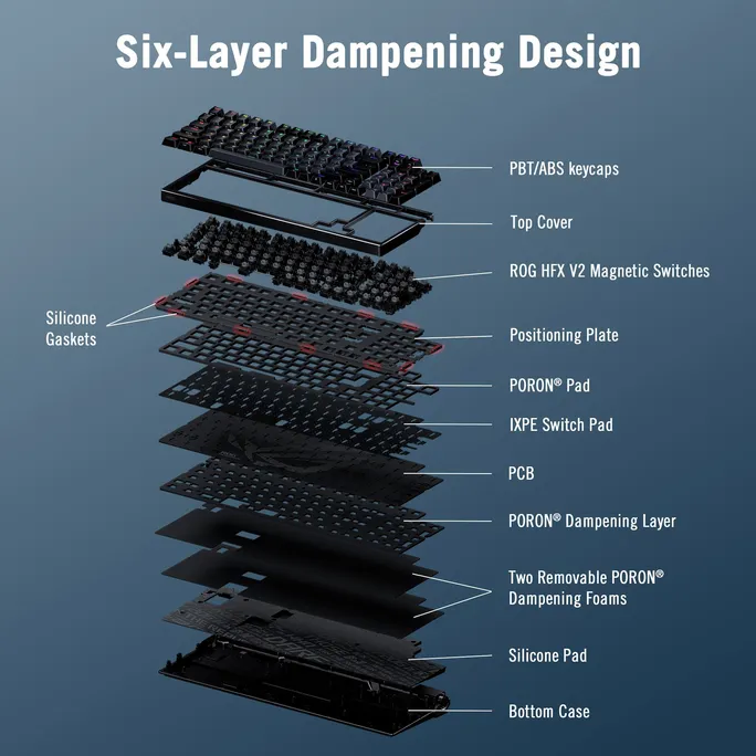 - PORON® Dämpfungsschicht: Absorbiert die Vibrationen des Tastenanschlags und minimiert das Geräusch der Schalter