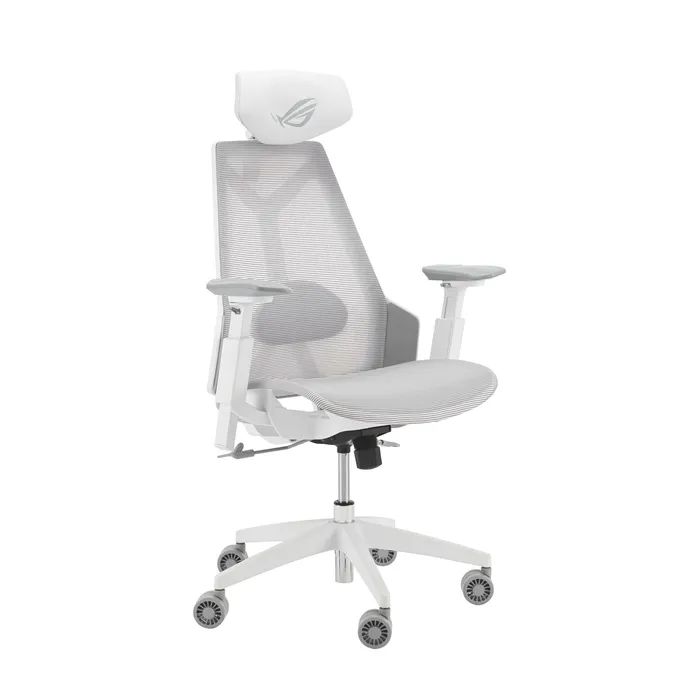 ASUS ROG Destrier Ergo Core White Gaming Stuhl (ergonomischer Gaming Chair, 360 Grad Armstützen mit bis zu 14cm Höhe für mobile Gaming, Nylonrahmen, Mesh, Lendenwirbelstütze und Kopfstütze, Weiß)