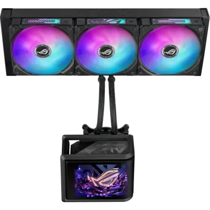 Die ROG Ryuo IV SLC 360 ARGB mit verkürzten Schläuchen sorgt für eine besonders klare Ästhetik, das bewegliche, gebogene 6,67-Zoll-AMOLED-Display unterstützt 3D-Videos, die mit bloßem Auge betrachtet werden können, oder zeigt benutzerdefinierte Systeminformationen an, und die vormontierten, in Reihe geschalteten ARGB-Lüfter mit Front- und Seitenbeleuchtung sind ein echter Blickfang.