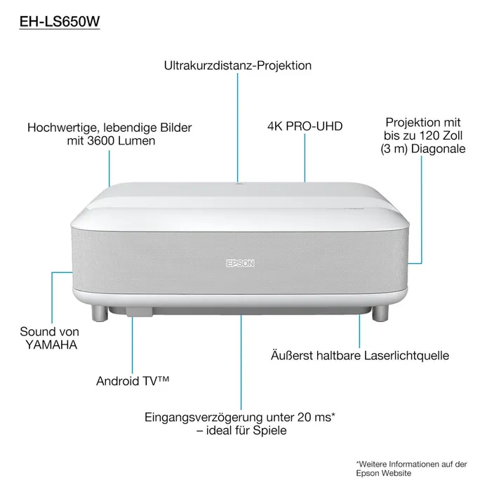 Epson EH-LS650W 3LCD Ultrakurzdist. Pojektor 3600 Lumen 4K PRO-UHD HDMI Weiß