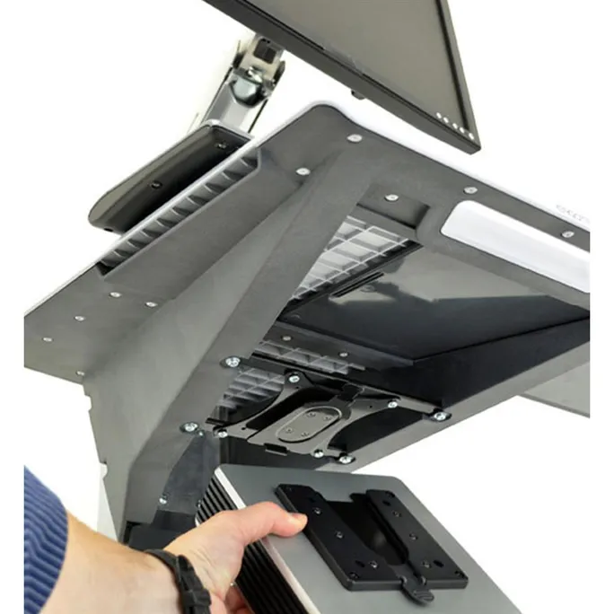 Die Unterseite der Arbeitsfläche dient zur Befestigung einer Thin-Client-CPU mit einer VESA-konformen Montageplatte.