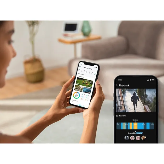 Entfalte das volle Potenzial mit smarter Sicherheit-die Gesichtserkennung unterscheidet zwischen Familie und Fremden, das Al-Video-Splicing erleichtert die Überprüfung von Ereignissen und die selbstlernende Al erstellt kundenspezifisch Sicherheitsberichte.
