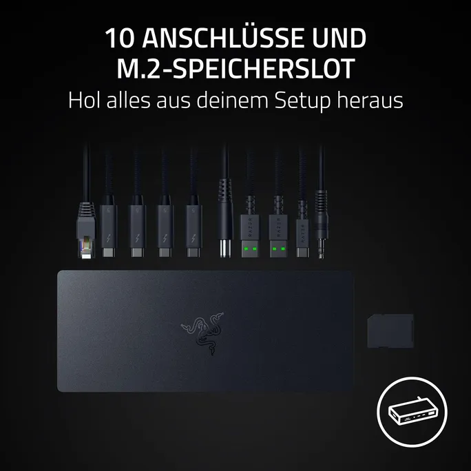 Gönn dir einen Quantensprung in Sachen Konnektivität für Desktop oder Laptop mit dem Razer Thunderbolt™ 5 Dock Chroma. Dank der schnellsten Übertragungsraten, 10 Ports, einem M.2-Speicherslot und Unterstützung von bis zu 3 4K-Displays @ 144 Hz bist du mit nur einer einzigen leistungsstarken Thunderbolt-Verbindung bestens ausgestattet.