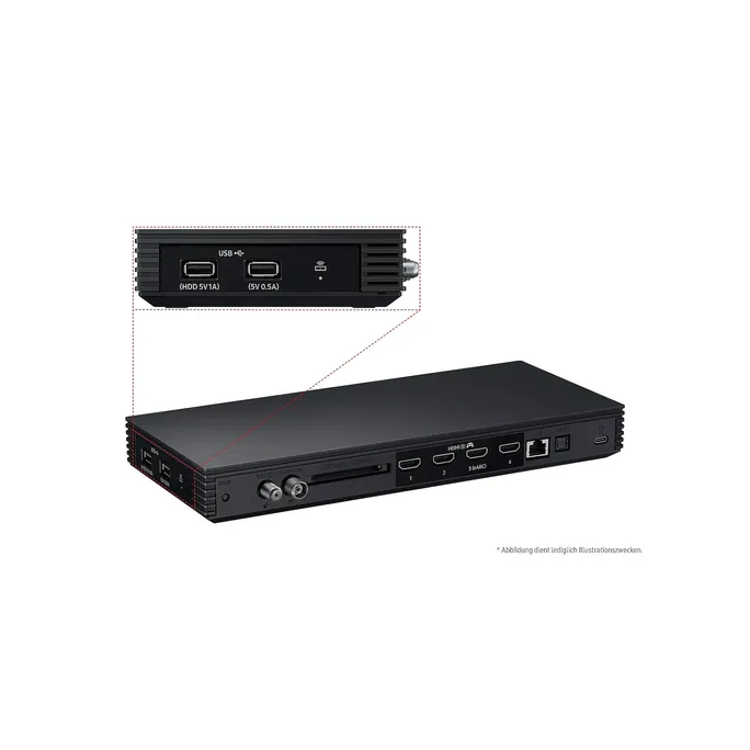 4 HDMI-AnschlüsseHDMI 2.0 Anschluss integriertAudio Return Channel2 USB-AnschlüsseEthernet (LAN)WLAN fähigBluetooth-Anschluss1 CI+ Slot(s)optischer DigitalausgangHDMI4USB2Netzwerkanschluss (LAN)JaDigital-Audioausgang (optisch)1Antenneneingänge3Ex-Link ( RS-232C )CI+-SlotHDMI-eARC (enhanced Audio Return Channel)Ja (HDMI 3)HDMI Quick SwitchWLANJa (WiFi5)BluetoothJa (BT5.2)Anynet+ (HDMI-CEC)One Connect BoxHDMI 2.1 Funktionen4K@120 Hz (auf HDMI-Port 4), VRR (Variable Refresh Rate), Dynamic Metadata (HDR10+), ALLM (Auto Game Mode), eARC (auf HDMI-Port 3)