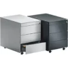 Schubladencontainer mit Rollen, HxT 570 x 800 mm, Stahlplatte, 3 Schubladen, anthrazitgrau / anthrazitgrau / anthrazitgrau. Anlieferung = montiert. Höhe = 570 mm. Breite = 417 mm. Tiefe = 800 mm. Utensilienschub = ja. Anzahl Materialschübe = 3 Stück. Auszug Materialschub = 75%. Innenmaße Materialschub HxBxT = 130x330x685 mm. Produkttyp = Rollcontainer. Material = Stahl, pulverbeschichtet. Korpusfarbe = anthrazitgrau RAL 7016. Korpusstärke = 0.75 mm. Schubladenmaterial = Stahlblech. Schubladenfarbe = anthrazitgrau RAL 7016. Schubladentraglast = 18 kg. Schubladen-Anzahl/Größe = 3 Stk HxBxT 130x330x685 mm. Schubladenführung = mit kugelgelagerten Teleskopauszügen. Eigenschaft = verschließbar, Auszugsperre. Radausstattung = 4 Rollen, davon 2 feststellbar. Raddurchmesser = 35 mm. Plattenstärke = 10 mm. Hochwertige Schubladenführung mit Selbsteinzug und Dämpfung. Alle Ausführungen mit Utensilienschub. Materialschübe 75%, Hängeregistraturen 100% ausziehbar. Schubladen mit Griffrinnen auf beiden Seiten und geschlossenem Boden. Hochwertige Führungen mit Selbsteinzug und Dämpfung. Auszugssperre und Drehzylinderschloss, verschiedenschließend. Stabiler, verschweißter Stahlblechkorpus mit hochwertiger Einbrennlackierung. Rollcontainer mit Abdeckplatte aus Stahl. Materialschübe 80% ausziehbar. Montierte Anlieferung.