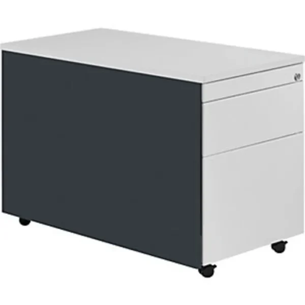 Schubladencontainer mit Rollen, HxT 579 x 800 mm, Kunststoffplatte, 1 Materialschub, 1 Hängeregistratur, anthrazitgrau / lichtgrau / lichtgrau. Anlieferung = montiert. Höhe = 579 mm. Breite = 417 mm. Tiefe = 800 mm. Utensilienschub = ja. Anzahl Hängeregistraturschübe = 1 Stück. Auszug Hängeregistratur = Vollauszug. Innenmaße Hängeregistratur HxBxT = 280x330x685 mm. Anzahl Materialschübe = 1 Stück. Auszug Materialschub = 75%. Innenmaße Materialschub HxBxT = 130x330x685 mm. Produkttyp = Rollcontainer. Material = Stahl, pulverbeschichtet. Korpusfarbe = anthrazitgrau RAL 7016. Korpusstärke = 0.75 mm. Schubladenmaterial = Stahlblech. Schubladenfarbe = lichtgrau RAL 7035. Schubladentraglast = 18 kg. Schubladen-Anzahl/Größe = 1 Stk HxBxT 130x330x685 mm, 1 Stk HxBxT 280x330x685 mm. Schubladenführung = mit kugelgelagerten Teleskopauszügen. Eigenschaft = verschließbar, Auszugsperre. Radausstattung = 4 Rollen, davon 2 feststellbar. Raddurchmesser = 35 mm. Plattenstärke = 19 mm. Hochwertige Schubladenführung mit Selbsteinzug und Dämpfung. Alle Ausführungen mit Utensilienschub. Materialschübe 75%, Hängeregistraturen 100% ausziehbar. Schubladen mit Griffrinnen auf beiden Seiten und geschlossenem Boden. Hochwertige Führungen mit Selbsteinzug und Dämpfung. Auszugssperre und Drehzylinderschloss, verschiedenschließend. Stabiler, verschweißter Stahlblechkorpus mit hochwertiger Einbrennlackierung. Abdeckplatte melaminharzbeschichtet 19 mm mit ABS-Umleimer. 1 Materialschub, 1 Hängeregistratur, kleine Schublade mit Teilauszug, große Schublade mit Vollauszug. Montierte Anlieferung.