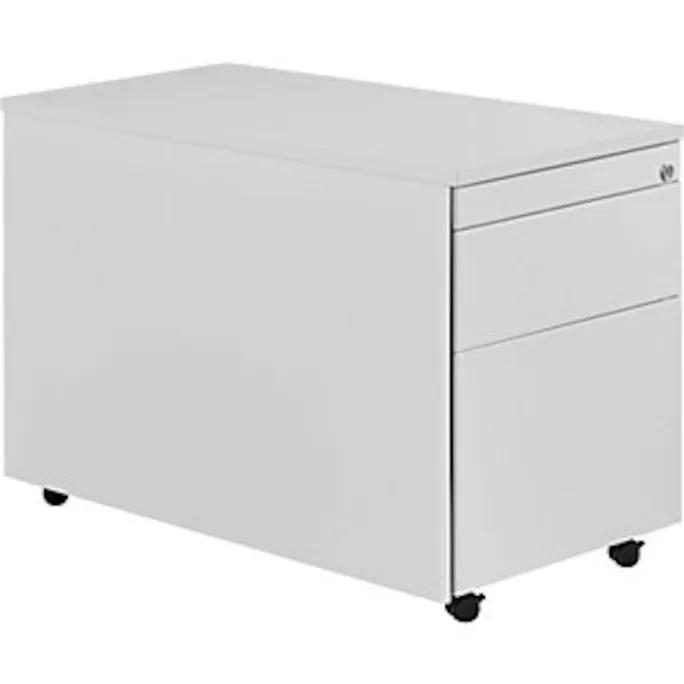 Schubladencontainer mit Rollen, HxT 579 x 800 mm, Kunststoffplatte, 1 Materialschub, 1 Hängeregistratur, lichtgrau / lichtgrau / lichtgrau. Anlieferung = montiert. Höhe = 579 mm. Breite = 417 mm. Tiefe = 800 mm. Utensilienschub = ja. Anzahl Hängeregistraturschübe = 1 Stück. Auszug Hängeregistratur = Vollauszug. Innenmaße Hängeregistratur HxBxT = 280x330x685 mm. Anzahl Materialschübe = 1 Stück. Auszug Materialschub = 75%. Innenmaße Materialschub HxBxT = 130x330x685 mm. Produkttyp = Rollcontainer. Material = Stahl, pulverbeschichtet. Korpusfarbe = lichtgrau RAL 7035. Korpusstärke = 0.75 mm. Schubladenmaterial = Stahlblech. Schubladenfarbe = lichtgrau RAL 7035. Schubladentraglast = 18 kg. Schubladen-Anzahl/Größe = 1 Stk HxBxT 130x330x685 mm, 1 Stk HxBxT 280x330x685 mm. Schubladenführung = mit kugelgelagerten Teleskopauszügen. Eigenschaft = verschließbar, Auszugsperre. Radausstattung = 4 Rollen, davon 2 feststellbar. Raddurchmesser = 35 mm. Plattenstärke = 19 mm. Hochwertige Schubladenführung mit Selbsteinzug und Dämpfung. Alle Ausführungen mit Utensilienschub. Materialschübe 75%, Hängeregistraturen 100% ausziehbar. Schubladen mit Griffrinnen auf beiden Seiten und geschlossenem Boden. Hochwertige Führungen mit Selbsteinzug und Dämpfung. Auszugssperre und Drehzylinderschloss, verschiedenschließend. Stabiler, verschweißter Stahlblechkorpus mit hochwertiger Einbrennlackierung. Abdeckplatte melaminharzbeschichtet 19 mm mit ABS-Umleimer. 1 Materialschub, 1 Hängeregistratur, kleine Schublade mit Teilauszug, große Schublade mit Vollauszug. Montierte Anlieferung.