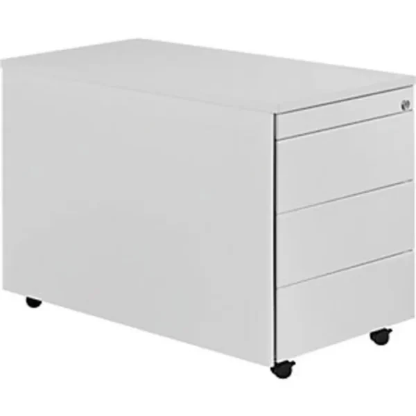 Schubladencontainer mit Rollen, HxT 579 x 800 mm, Kunststoffplatte, 3 Schubladen, lichtgrau / lichtgrau / lichtgrau. Anlieferung = montiert. Höhe = 579 mm. Breite = 417 mm. Tiefe = 800 mm. Utensilienschub = ja. Anzahl Materialschübe = 3 Stück. Auszug Materialschub = 75%. Innenmaße Materialschub HxBxT = 130x330x685 mm. Produkttyp = Rollcontainer. Material = Stahl, pulverbeschichtet. Korpusfarbe = lichtgrau RAL 7035. Korpusstärke = 0.75 mm. Schubladenmaterial = Stahlblech. Schubladenfarbe = lichtgrau RAL 7035. Schubladentraglast = 18 kg. Schubladen-Anzahl/Größe = 3 Stk HxBxT 130x330x685 mm. Schubladenführung = mit kugelgelagerten Teleskopauszügen. Eigenschaft = verschließbar, Auszugsperre. Radausstattung = 4 Rollen, davon 2 feststellbar. Raddurchmesser = 35 mm. Plattenstärke = 19 mm. Hochwertige Schubladenführung mit Selbsteinzug und Dämpfung. Alle Ausführungen mit Utensilienschub. Materialschübe 75%, Hängeregistraturen 100% ausziehbar. Schubladen mit Griffrinnen auf beiden Seiten und geschlossenem Boden. Hochwertige Führungen mit Selbsteinzug und Dämpfung. Auszugssperre und Drehzylinderschloss, verschiedenschließend. Stabiler, verschweißter Stahlblechkorpus mit hochwertiger Einbrennlackierung. Abdeckplatte melaminharzbeschichtet 19 mm mit ABS-Umleimer. 3 Schubladen auf kugelgelagerten Teleskopschienen, Teilauszug. Montierte Anlieferung.