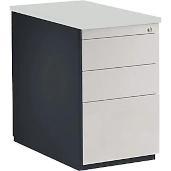 Schubladencontainer, HxT 720 x 800 mm, 2 Materialschübe, 1 Hängeregistratur, anthrazitgrau / lichtgrau / lichtgrau. Anlieferung = montiert. Höhe = 720 mm. Breite = 417 mm. Tiefe = 800 mm. Utensilienschub = ja. Anzahl Hängeregistraturschübe = 1 Stück. Auszug Hängeregistratur = 100%. Innenmaße Hängeregistratur HxBxT = 280x330x685 mm. Anzahl Materialschübe = 2 Stück. Auszug Materialschub = 75%. Innenmaße Materialschub HxBxT = 130x330x685 mm. Produkttyp = Standcontainer. Material = Stahl, pulverbeschichtet. Korpusfarbe = anthrazitgrau RAL 7016. Korpusstärke = 0.75 mm. Schubladenmaterial = Stahlblech. Schubladenfarbe = lichtgrau RAL 7035. Schubladentraglast = 18 kg. Schubladen-Anzahl/Größe = 2 Stk HxBxT 130x330x685 mm, 1 Stk HxBxT 280x330x685 mm. Schubladenführung = mit kugelgelagerten Teleskopauszügen. Eigenschaft = Auszugsperre, verschließbar. Plattenstärke = 25 mm. Schubladen mit Griffrinnen auf beiden Seiten und geschlossenem Boden. Hochwertige Führungen mit Selbsteinzug und Dämpfung. Auszugssperre und Drehzylinderschloss, verschiedenschließend. Stabiler, verschweißter Stahlblechkorpus mit hochwertiger Einbrennlackierung. Standcontainer mit Abdeckplatte aus Kunststoff, melaminharzbeschichtet. 2 Materialschübe, 1 Hängeregistratur, 1 Utensilienschub. Materialschübe 75%, Hängeregistraturen 100% ausziehbar. Montierte Anlieferung. Gleichschließung auf Anfrage.