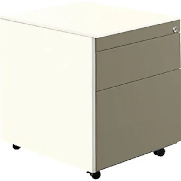 Schubladencontainer mit Rollen, HxT 570 x 600 mm, 1 Materialschub, 1 Hängeregistratur, reinweiß / beigegrau / reinweiß. Anlieferung = montiert. Höhe = 570 mm. Breite = 417 mm. Tiefe = 600 mm. Utensilienschub = ja. Anzahl Hängeregistraturschübe = 1 Stück. Auszug Hängeregistratur = 100%. Innenmaße Hängeregistratur HxBxT = 280x330x485 mm. Anzahl Materialschübe = 1 Stück. Auszug Materialschub = 75%. Innenmaße Materialschub HxBxT = 130x330x485 mm. Produkttyp = Rollcontainer. Material = Stahl, pulverbeschichtet. Korpusfarbe = reinweiß RAL 9010. Korpusstärke = 0.75 mm. Schubladenmaterial = Stahlblech. Schubladenfarbe = beigegrau RAL 7006. Schubladentraglast = 18 kg. Schubladen-Anzahl/Größe = 1 Stk HxBxT 130x330x485 mm, 1 Stk HxBxT 280x330x485 mm. Schubladenführung = mit kugelgelagerten Teleskopauszügen. Eigenschaft = verschließbar, Auszugsperre. Radausstattung = 4 Rollen, davon 2 feststellbar. Raddurchmesser = 35 mm. Plattenstärke = 10 mm. Hochwertige Schubladenführung mit Selbsteinzug und Dämpfung. Alle Ausführungen mit Utensilienschub. Materialschübe 75%, Hängeregistraturen 100% ausziehbar. Schubladen mit Griffrinnen auf beiden Seiten und geschlossenem Boden. Hochwertige Führungen mit Selbsteinzug und Dämpfung. Auszugssperre und Drehzylinderschloss, verschiedenschließend. Stabiler, verschweißter Stahlblechkorpus mit hochwertiger Einbrennlackierung. Rollcontainer mit Abdeckplatte aus Stahl. Materialschübe 80%, Hängeregistraturen 100% ausziehbar. Montierte Anlieferung.