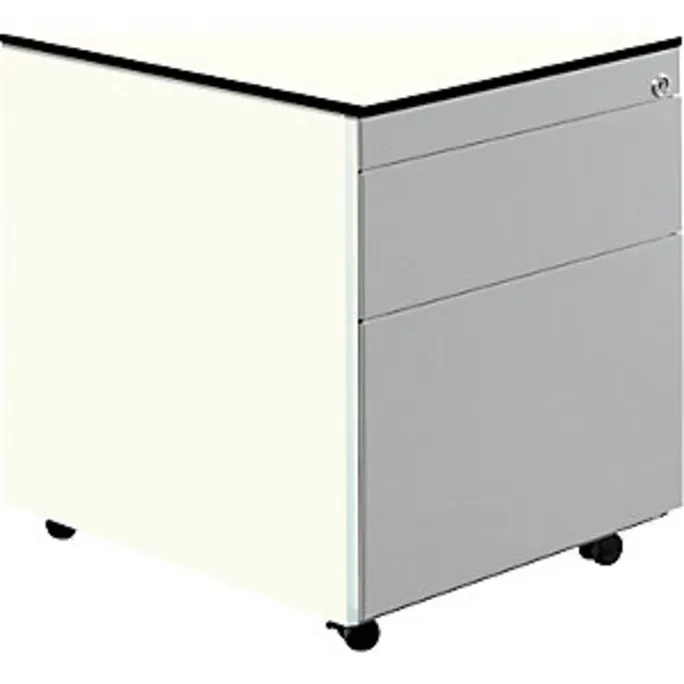 Schubladencontainer mit Rollen, HxT 573 x 600 mm, 1 Materialschub, 1 Hängeregistratur, reinweiß / weißaluminium / weiß. Anlieferung = montiert. Höhe = 573 mm. Breite = 417 mm. Tiefe = 600 mm. Utensilienschub = ja. Anzahl Hängeregistraturschübe = 1 Stück. Auszug Hängeregistratur = Vollauszug. Innenmaße Hängeregistratur HxBxT = 280x330x485 mm. Anzahl Materialschübe = 1 Stück. Auszug Materialschub = 75%. Innenmaße Materialschub HxBxT = 130x330x485 mm. Produkttyp = Rollcontainer. Material = Stahl, pulverbeschichtet. Korpusfarbe = reinweiß RAL 9010. Korpusstärke = 0.75 mm. Schubladenmaterial = Stahlblech. Schubladenfarbe = weißaluminium RAL 9006. Schubladentraglast = 18 kg. Schubladen-Anzahl/Größe = 1 Stk HxBxT 130x330x485 mm, 1 Stk HxBxT 280x330x485 mm. Schubladenführung = mit kugelgelagerten Teleskopauszügen. Eigenschaft = verschließbar, Auszugsperre. Radausstattung = 4 Rollen, davon 2 feststellbar. Raddurchmesser = 35 mm. Plattenstärke = 13 mm. Hochwertige Schubladenführung mit Selbsteinzug und Dämpfung. Alle Ausführungen mit Utensilienschub. Materialschübe 75%, Hängeregistraturen 100% ausziehbar. Schubladen mit Griffrinnen auf beiden Seiten und geschlossenem Boden. Hochwertige Führungen mit Selbsteinzug und Dämpfung. Auszugssperre und Drehzylinderschloss, verschiedenschließend. Stabiler, verschweißter Stahlblechkorpus mit hochwertiger Einbrennlackierung. Abdeckplatte HPL-Vollkern 13 mm, Kante schwarz. 1 Materialschub, 1 Hängeregistratur, kleine Schublade mit Teilauszug, große Schublade mit Vollauszug. Montierte Anlieferung.