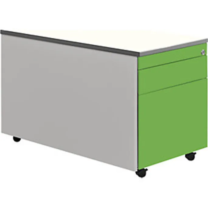Schubladencontainer mit Rollen, HxT 529 x 800 mm, 1 Materialschub, 1 Hängeregistratur, weißaluminium / gelbgrün / weiß. Anlieferung = montiert. Höhe = 529 mm. Breite = 417 mm. Tiefe = 800 mm. Utensilienschub = ja. Anzahl Hängeregistraturschübe = 1 Stück. Auszug Hängeregistratur = Vollauszug. Innenmaße Hängeregistratur HxBxT = 280x330x685 mm. Anzahl Materialschübe = 1 Stück. Auszug Materialschub = 75%. Innenmaße Materialschub HxBxT = 80x330x685 mm. Produkttyp = Rollcontainer. Material = Stahl, pulverbeschichtet. Korpusfarbe = weißaluminium RAL 9006. Korpusstärke = 0.75 mm. Schubladenmaterial = Stahlblech. Schubladenfarbe = gelbgrün RAL 6018. Schubladentraglast = 18 kg. Schubladen-Anzahl/Größe = 1 Stk HxBxT 80x330x685 mm, 1 Stk HxBxT 280x330x685 mm. Schubladenführung = mit kugelgelagerten Teleskopauszügen. Eigenschaft = verschließbar, Auszugsperre. Radausstattung = 4 Rollen, davon 2 feststellbar. Raddurchmesser = 35 mm. Plattenstärke = 19 mm. Hochwertige Schubladenführung mit Selbsteinzug und Dämpfung. Alle Ausführungen mit Utensilienschub. Materialschübe 75%, Hängeregistraturen 100% ausziehbar. Schubladen mit Griffrinnen auf beiden Seiten und geschlossenem Boden. Hochwertige Führungen mit Selbsteinzug und Dämpfung. Auszugssperre und Drehzylinderschloss, verschiedenschließend. Stabiler, verschweißter Stahlblechkorpus mit hochwertiger Einbrennlackierung. Abdeckplatte melaminharzbeschichtet 19 mm mit ABS-Umleimer. 1 Materialschub, 1 Hängeregistratur, kleine Schublade mit Teilauszug, große Schublade mit Vollauszug. Montierte Anlieferung.