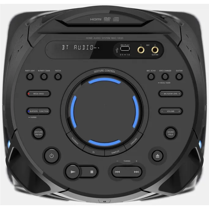 Mit einer vertikalen oder horizontalen Handbewegung können Sie einen Titel überspringen, von Flanger zu WAH wechseln, das Karaoke-Mikrofon aufdrehen, die Tonhöhe von Mikrofon und Musik steuern oder die Lautstärke aufdrehen. Mit der Gestensteuerung können Sie die Funktionen des MHC-V43D schnell und einfach bedienen und so entspannt mit Ihren Gästen feiern.